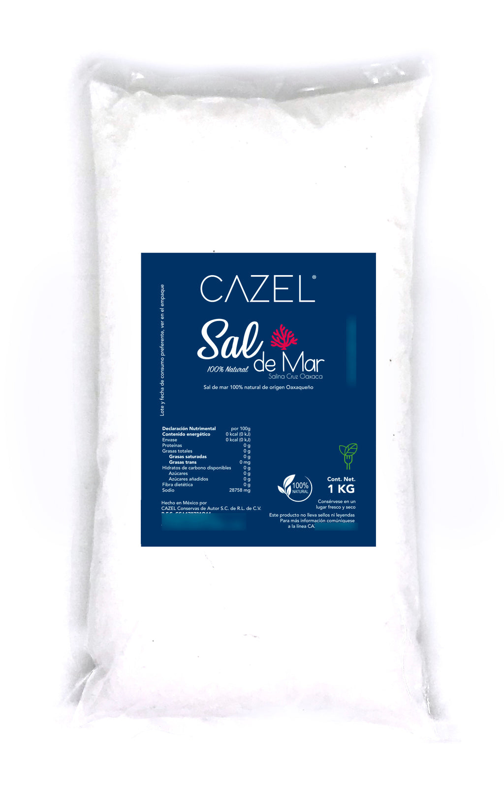Producto 60 % más bajo en sodio que la sal convencional de mesa, libre de flúor, yodo y químicos.